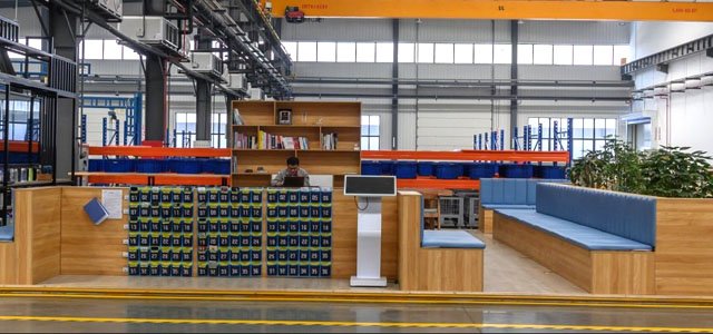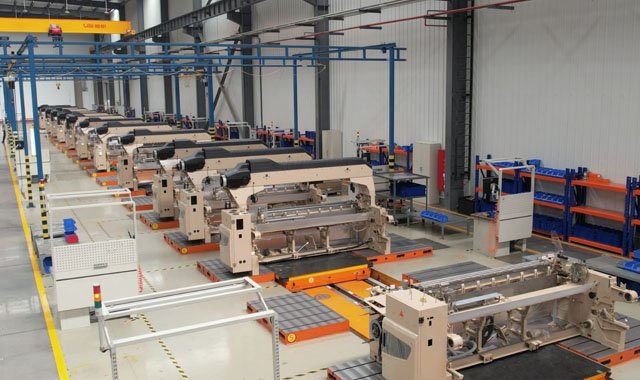 海佳現(xiàn)代化智能總裝車間是國際著名設(shè)計(jì)公司為海佳機(jī)械定制設(shè)計(jì)的全球首個織機(jī)脈動式裝配生產(chǎn)線體。整個總裝車間由平臺安裝區(qū)、脈動線組裝區(qū)、模組組裝區(qū)、試機(jī)平臺區(qū)四個部分組成。整個裝配過程的物料運(yùn)轉(zhuǎn)和配送,全部由AGV和RGV系統(tǒng)自動調(diào)度,整條線體除了整機(jī)裝配外,全部實(shí)現(xiàn)自動化生產(chǎn)。目前線體承擔(dān)的是海佳噴水織機(jī)和噴氣織機(jī)的裝配,單班每天的產(chǎn)量在21-22臺。